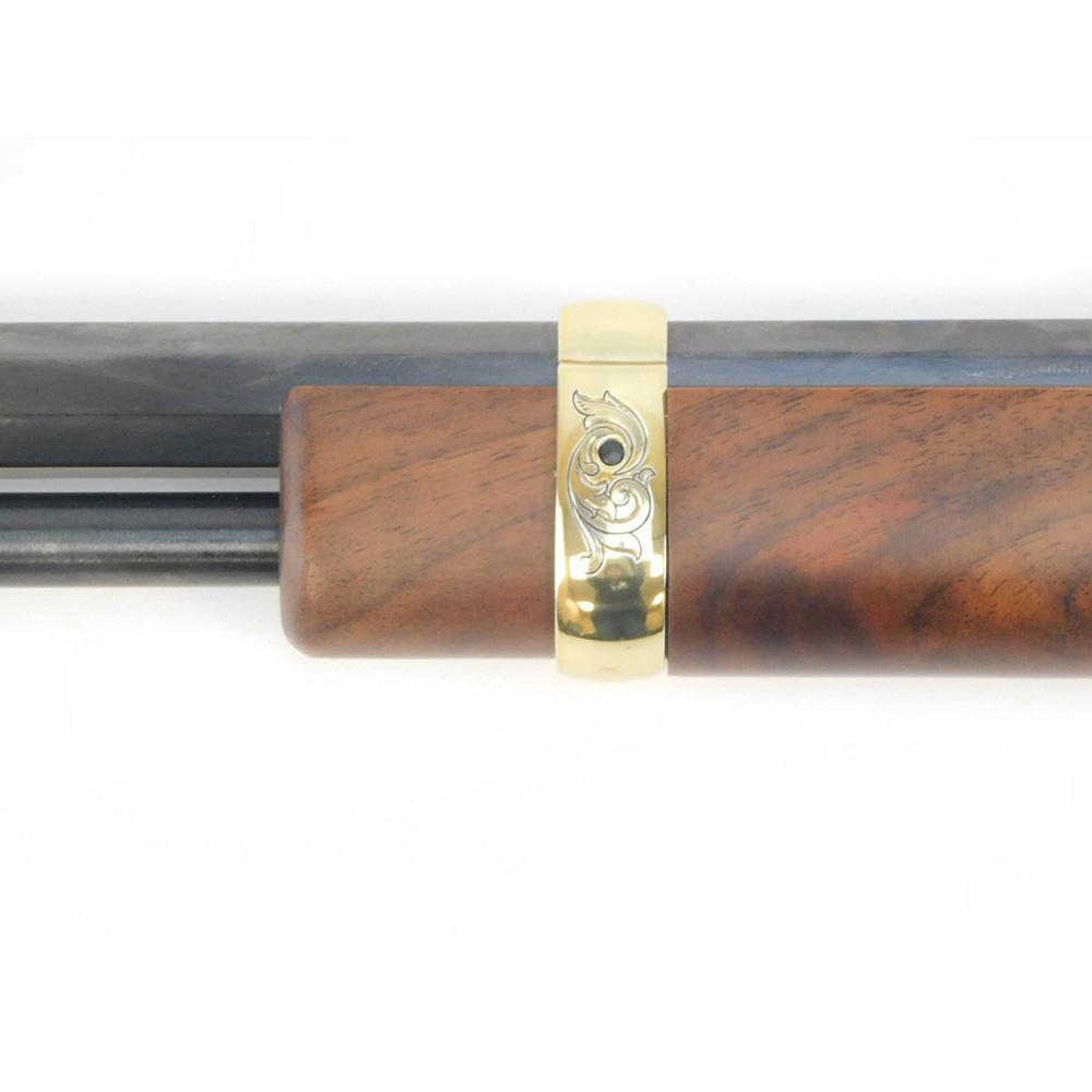 The Golden Boy Deluxe Engraved 4th Edition rifle is a masterpiece in its own right. It features a Brasslite receiver cover and barrel band, both engraved with ornate scrollwork inspired by the 19th-century greats. Meticulous stippling throughout the intertwining scrolls adds depth and contrast, while a scalloped border frames the design on each panel. The brass barrel band is engraved on both sides with another flourishing scroll to match the receiver cover, creating a design that is sure to captivate any firearm enthusiast.While not the result of an artist’s hand, we selected Fancy-grade American Walnut for these rifles, which are works of art in their own right.