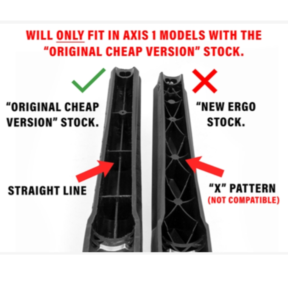 Please note, this stabilizer kit WILL NOT WORK with the newer "Ergo-Stock" on Savage AXIS 1 models. It is exclusively designed for Savage AXIS 1 models equipped with the original stock, characterized by a specific forend structure (The original stock should have a fully removable trigger guard, unlike the new Ergo stock). A sides-by-side comparison of the original stock and the new Ergo stock should help identify compatibility. (See Photo)