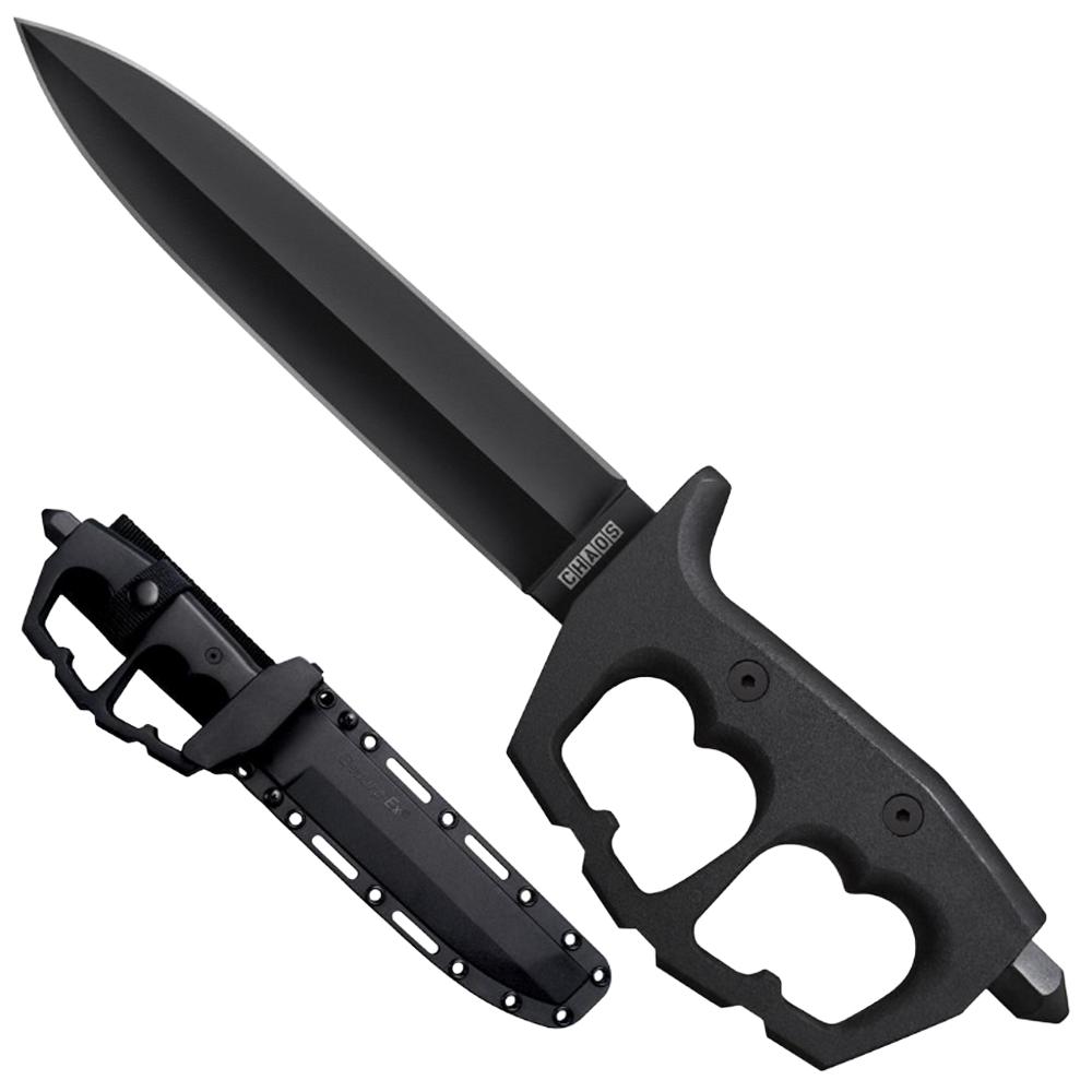 Taking inspiration from the classic "Trench Knives" from both World Wars of the last century, we have developed a series of new tactical fixed blades that are suitable for the challenges faced by today's modern day warriors.Our Chaos series fixed blades are equipped with unique "D" ring guards made from reinforced 6061 aluminum, allowing for an incredibly secure and comfortable grip while protecting the hand both from incoming attack and damage while striking or cutting an opponent who's covered in body armor, ammo, flashlights, magazines and gear! Their extra thick 1055 carbon steel pommels are tapered to concentrate the percussive force of a hammering strike, and their full tang SK-5 High Carbon steel blades are expertly heat treated for maximum performance.Their tough Secure-Exª sheaths are Molle-Lok and Tek-Lok compatible, with rugged adjustable Cor-Ex belt loops and retaining straps for a secure and reliable lock up when not in use.The Chaos series combine maximum safety and security with extreme performance and combat potential.