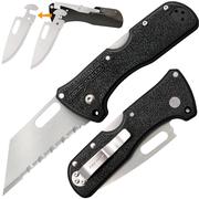 Most, if not all, replaceable blade knives share the same common failings. Their blades are thin, narrow, brittle and puny! And if they fold their locking mechanisms are egregiously weak! Now Cold Steel® introduces a folding knife with 1.5 mm thick interchangeable blades and has the value of a sufficiently strong locking mechanism. Like our Click-N-Cut knives, it incorporates elements of our strong Tri-Ad® lock for superior strength. It comes with a drop point blade and a serrated utility blade. Both blades can be re-sharpened with little effort or discarded and easily replaced. Installing or changing a blade is simple. With the blade open, just depress the lock bar and fold the blade down about 70° and slide it out. Click in a new blade and you're back in business! Simple, economical, and astoundingly practical!