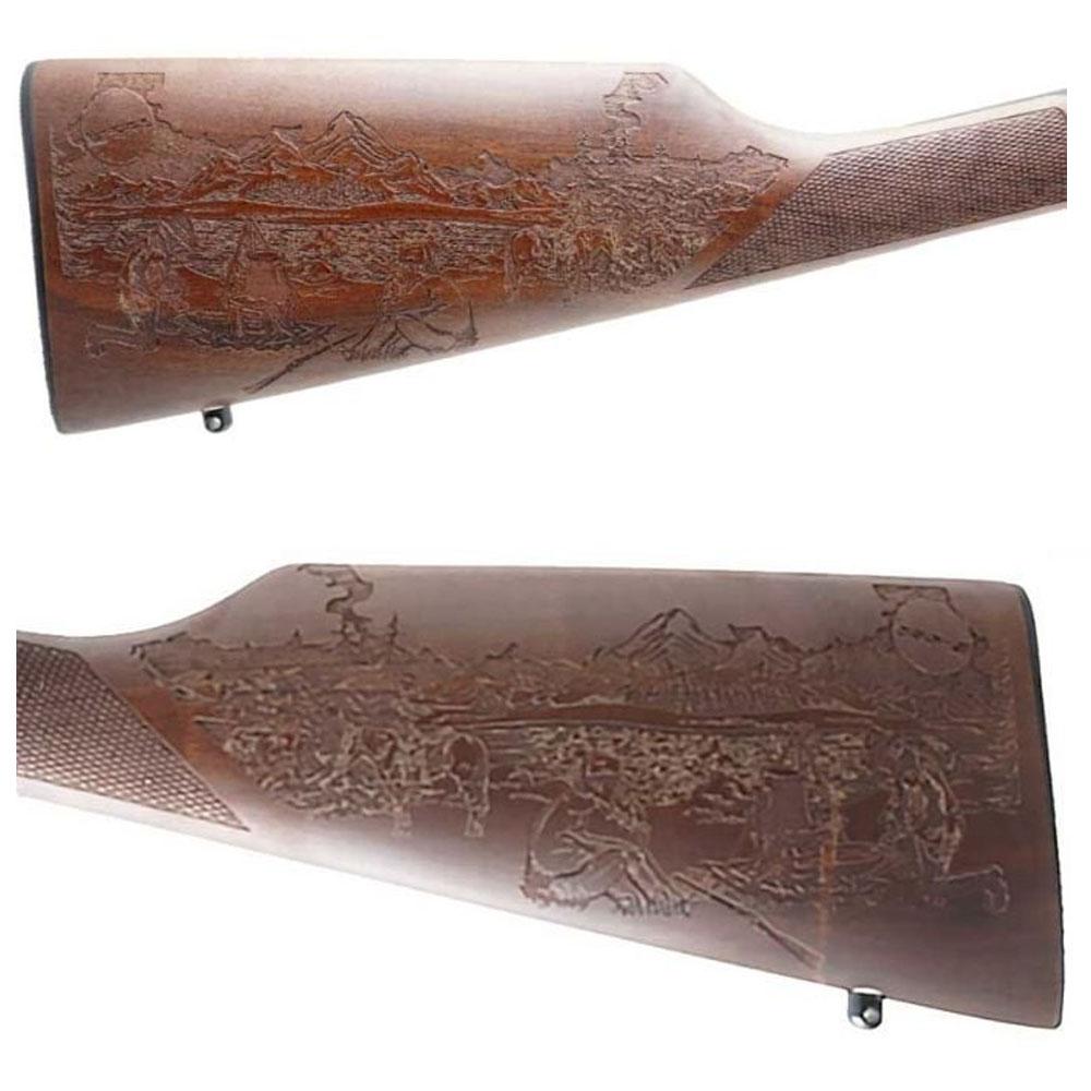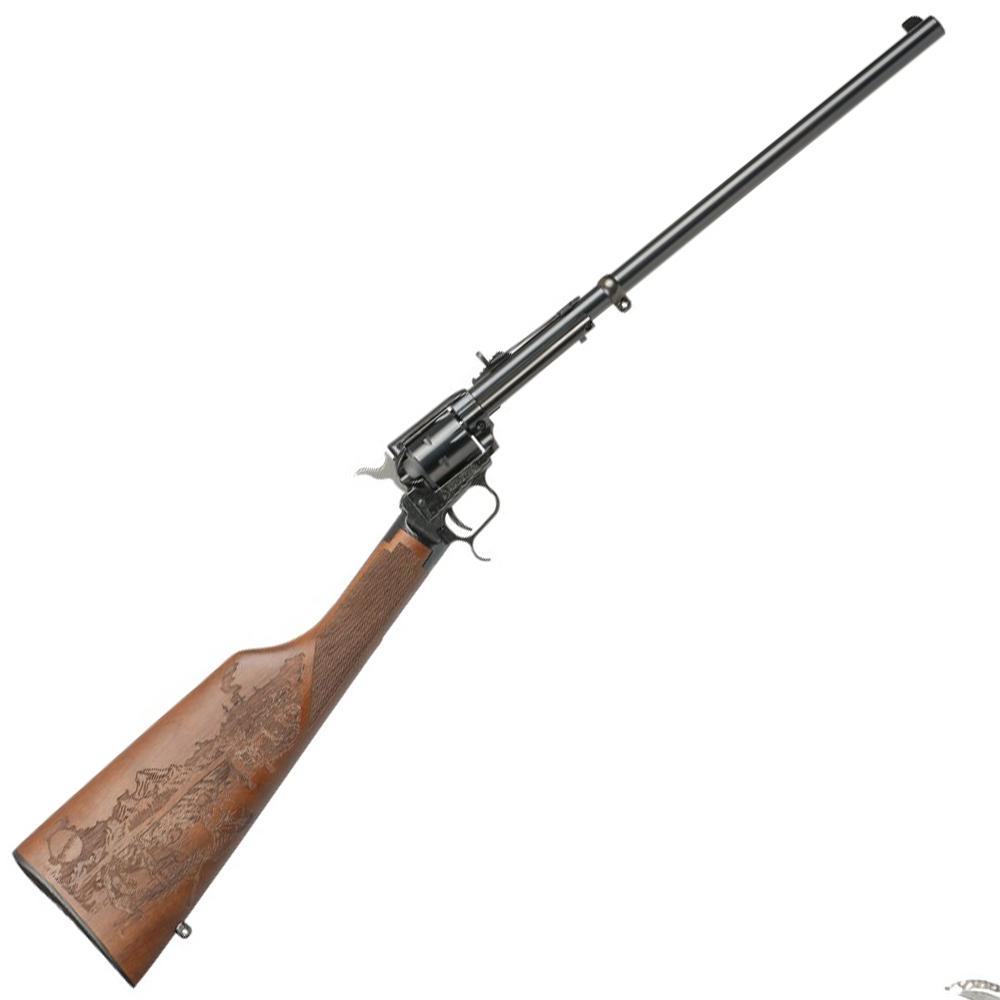 The Heritage Manufacturing Rough Rider Rancher Carbine is a unique addition to the Rough Rider Series, offering a blend of classic revolver action with the distinctive appearance and functionality of a carbine. This single-action revolver, chambered in .22 LR, combines traditional aesthetics with practical features, making it a fascinating piece for collectors and shooters alike. With its black oxide finish and intricately engraved walnut stocks, the Rough Rider Rancher Carbine stands out for its craftsmanship and design.