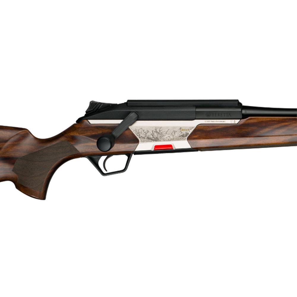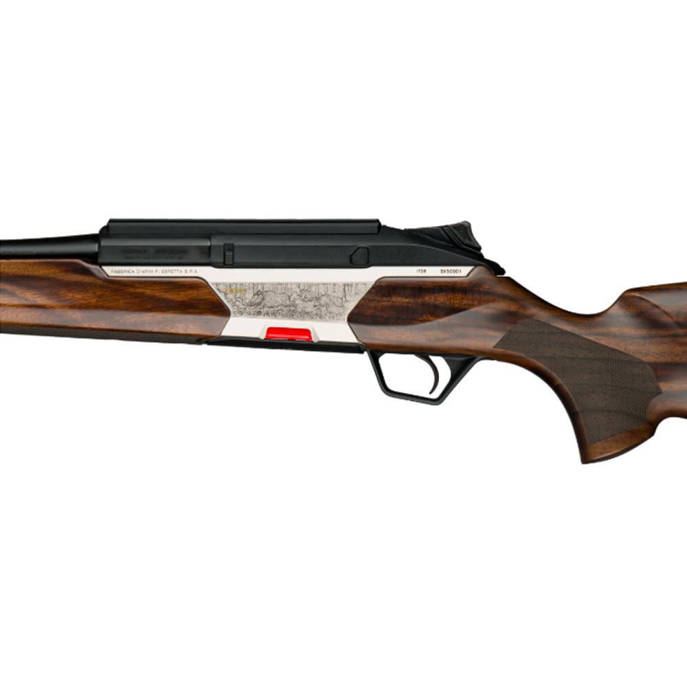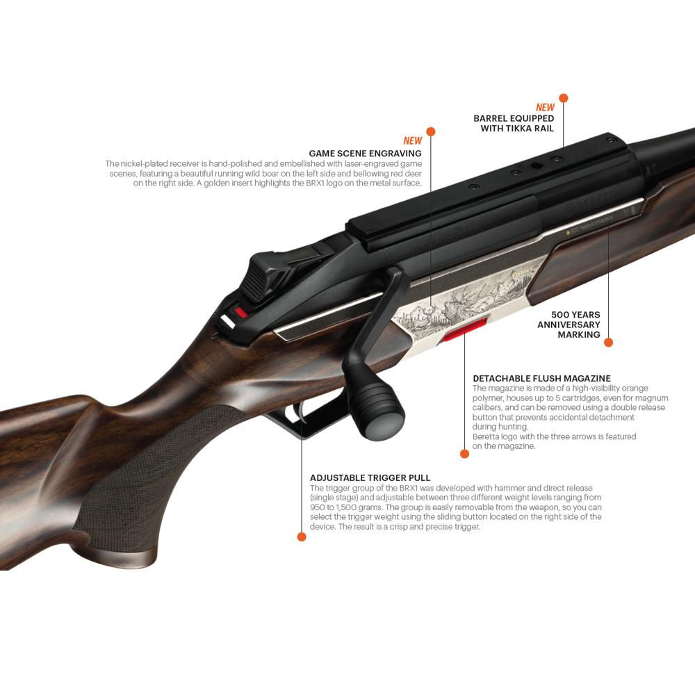 For the first time, the BRX1 500 Years Limited Edition comes with a refined wood stock and forend straight from the factory. At its heart, an evocative big game engraving comes to life on the nickel-plated hand-polished receiver, depicting wild boar and bellowing deer. A celebration of tradition and craftsmanship, this scene creates a striking dialogue with the rifle’s modern soul, emphasized by the iconic high-visibility orange 5-round magazine.