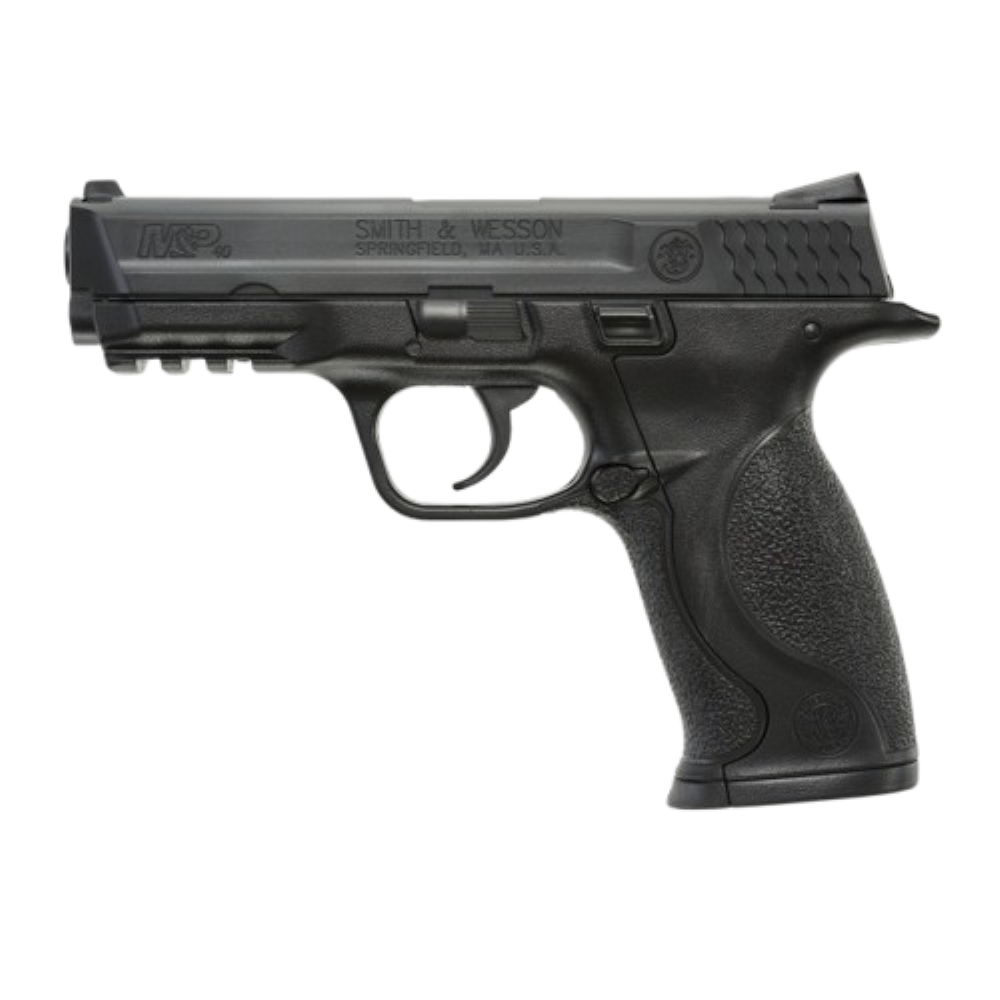 The Smith & Wesson M&P air pistol is a BB repeater powered by one 12g CO2 cylinder in the grip. An integrated accessory rail underneath the muzzle makes adding a tactical light or laser easy.
